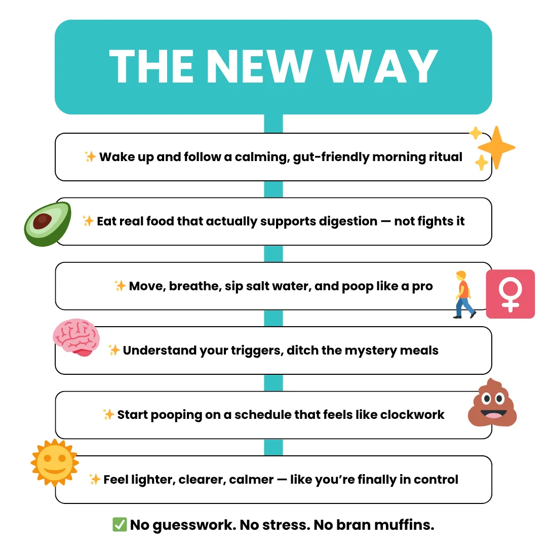 Now imagine following a gut-friendly plan that actually makes sense — one that works with your body, not against it. No more confusion, no more extremes. Just clarity, relief, and results you can feel (and yes, see in the toilet).